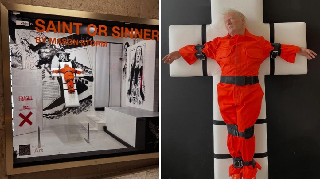 這件名為〈聖人還是罪人?〉(Saint or Sinner?)的作品出自英國倫敦出生的藝術家梅森・史托姆(Mason Storm)之手。他以創作具政治與社會諷刺性的爭議作品聞名;經常「戴面罩或頭套保持匿名」,也成為其個人品牌的標誌。