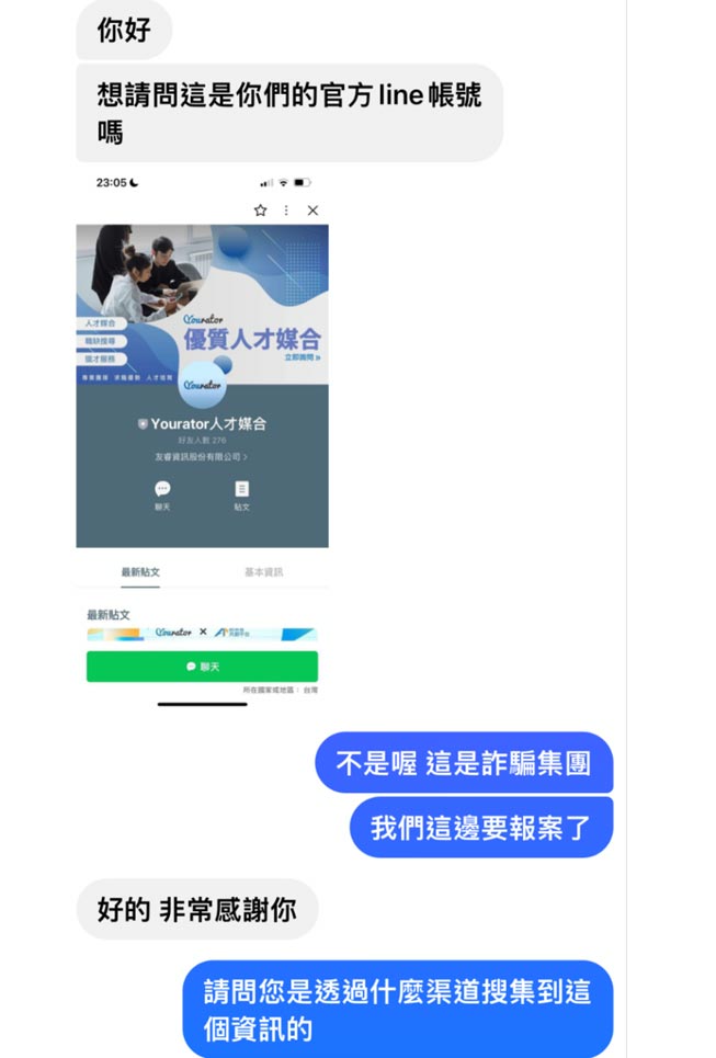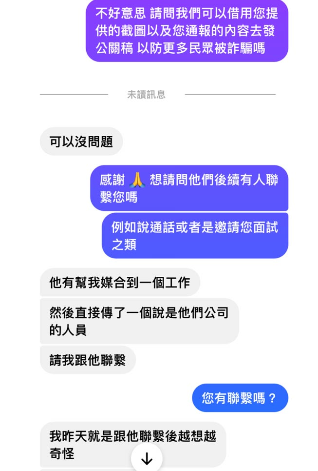 為了避免受害人數擴大,Yourator 對外分享受害者遇到的詐騙情境,以及警局報案經過,希望藉該平台經驗,協助提醒求職者提高警覺、自我保護。