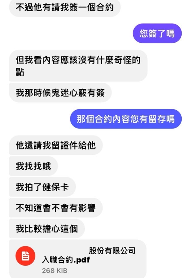除了前述求職者,6/14 出現第 2 位求職者詢問相同問題,確認該帳號是否為真實的 Yourator 官方帳號。不同的是,第 2 位反映的求職者已經透過假帳號找到工作,而且簽署了入職文件,甚至繳交健保卡影本。對方更要求該求職者繳交 500 元求職金,不過該求職者查資料後覺得不對勁,並未繳錢給對方,並向 Yourator 求助。