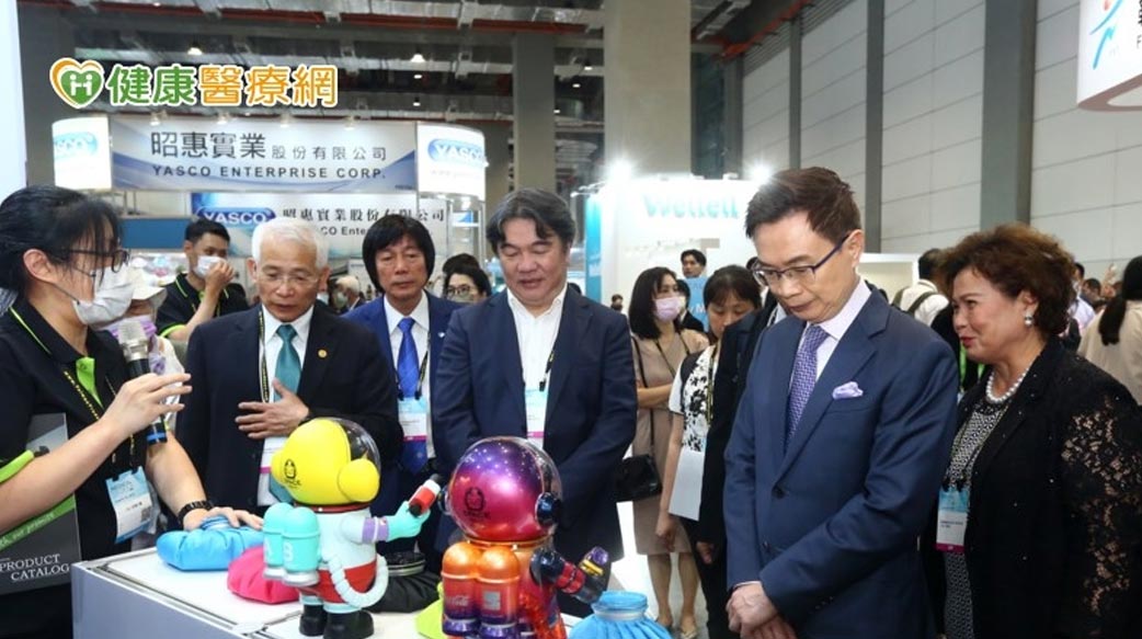 台灣國際醫療暨健康照護展中,主辦單位貿協黃志芳董事長(右2)與貴賓一同參觀亮點企業的產品。(貿協提供)
