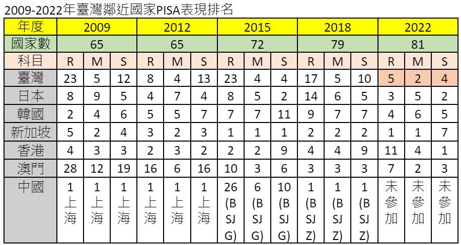上述七個相當重視升學的亞洲國家,長期都在排名的領先群,新加坡始終是常勝軍,香港其次;日本、韓國表現一直都不弱,澳門近二次都後來居上,中國此次未參加,前次第一。臺灣在2015年數學與自然的表現不錯,當時並未歸因於課程改革,本次表現較2018年進步,若歸因於新課綱的實施,需要有更充分的證據支持才是。其他六個國家雖未進行課程改革,仍有不錯的表現,值得我們探究。