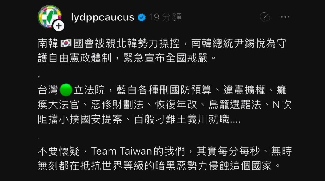 首先,民進黨團這篇「戒嚴文」憑什麼在開頭首段就斷定南韓國會就是受控於「親北韓勢力」?憑什麼斷定南韓總統尹錫悅宣布戒嚴就是基於「守護自由憲政」?比起論述的顛倒是非,更犯外交大忌的是妄議干預他國內政!果不其然,即便綠營火速刪文,結果此文早已紛紛被韓媒轉載「台灣執政黨支持戒嚴」,敗壞我國的國際形象、民主聲譽,簡直可說「丟臉丟到國外」!