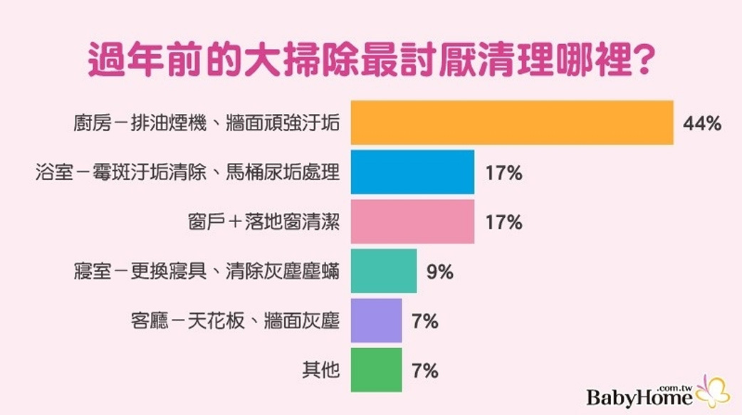 每年一度的大掃除,讓許多媳婦想到就頭大,據BabyHome調查顯示,4成媽咪們最不想面對的是恐怖大魔王「廚房-排油煙機、牆面頑強汙垢」,其次同為17%的有「浴室-霉斑汙垢清除、馬桶尿垢處理」,以及「浴室-霉斑汙垢清除、馬桶尿垢處理」。