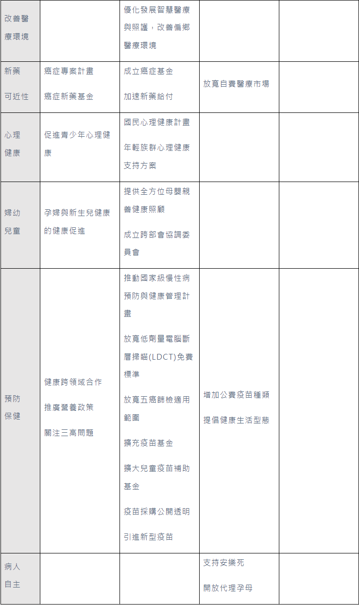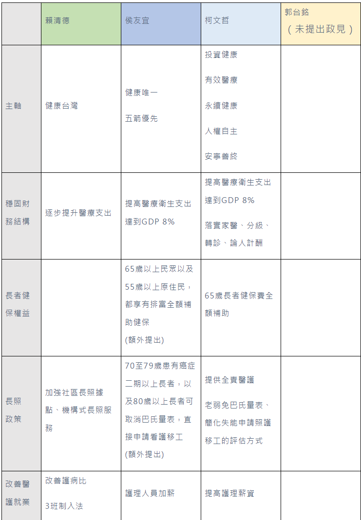而且,各候選人都關注於健康政策,但卻未對現行問題提出批評,也未務實面對台灣醫療政策中存在的財務缺口。稅收和健保都是有限的資源,一個地方增加了預算,就會排擠其他社福預算。