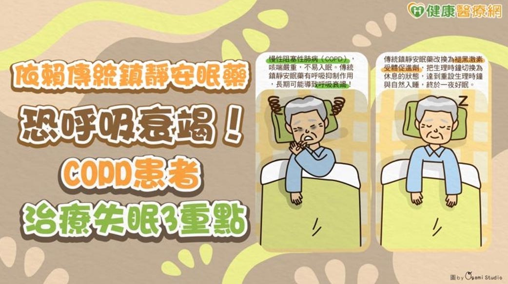 一位8旬慢性阻塞性肺病(COPD)爺爺咳喘嚴重,加上喪妻後悲傷失眠,服用安眠藥竟出現譫妄與躁動副作用!後來將傳統鎮靜安眠藥改換為褪黑激素受體促進劑,老爺爺就不再出現譫妄,終於能夠一夜好眠。莊立邦主任提醒,傳統安眠藥有抑制呼吸作用,COPD患者長期使用恐導致呼吸抑制,呼籲患者積極控制肺病症狀、適當運動復健,並且與醫師討論用藥策略以改善失眠。